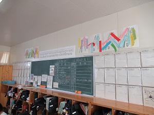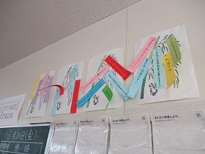 いつもは班を作って班ごとに食べていますが、今はまだ、正面を向いてお弁当を食べています。教室の後方には、七夕の短冊が貼ってあって、一人一人の思いを掲げていました。