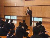9日は、中学高校合同の対面式の後、中学校全体集会を実施しました。