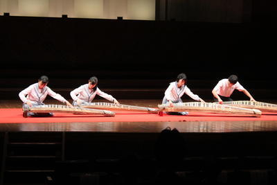 私達箏曲部は三年生四人、二年生一人、一年生四人の計九人で活動しています。少ない人数ですが迫力と感動のある演奏ができるように心がけて日々活動しています。箏の合奏は指揮者がいないため、部員全体が呼吸を合わせる必要があります。そのため、部員同士のつながりは強く、みんなで教え合い、励まし合い、笑い合える部活を目指しています。部員全員が高校から箏を始めた初心者ですので、初心者の方も気軽に参加してください。
