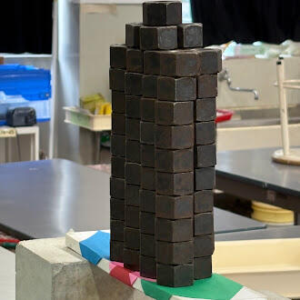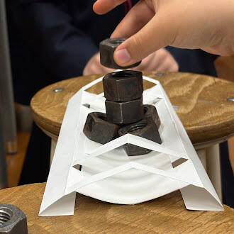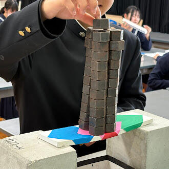 「早く8個の基準を満たす橋をつくりたい」という意識で始まりましたが、どんどん成功していく中で徐々に生徒たちの取り組みが変化し「最強の橋をつくろう」に全体の流れが変化しました。本校にはナットが84個あったので、すべて乗ると10.3㎏。84個載せることに2クラス(およそ55人)が挑戦して4人が成功しました。