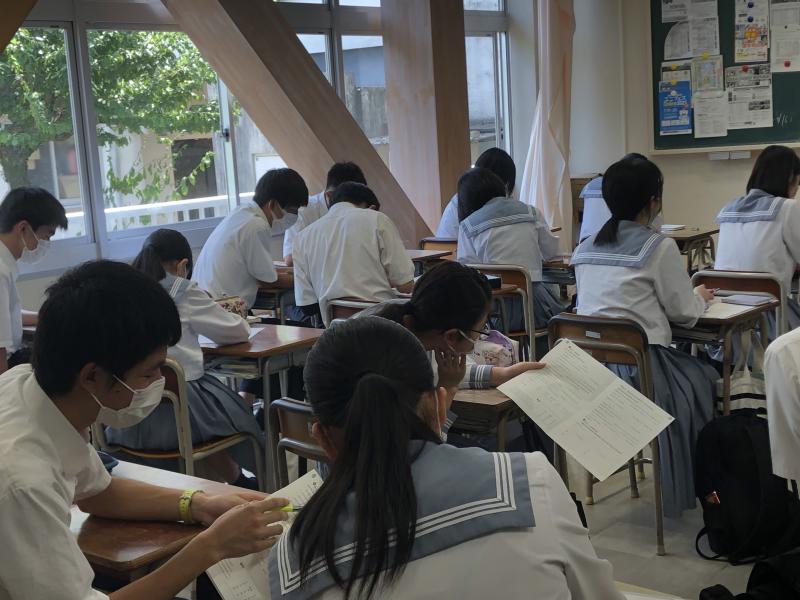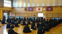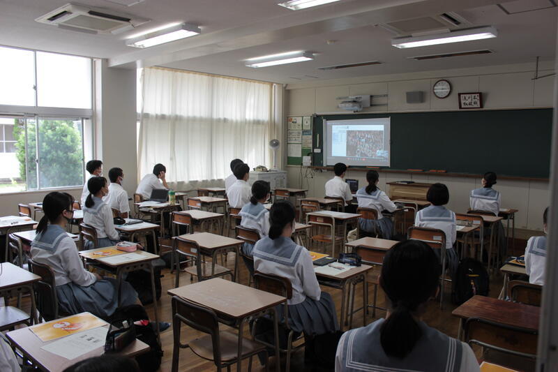 コロナ禍の分散登校期間中であったため、登校している生徒は各クラスに配信される講演を、在宅の生徒はYou Tube Liveで配信される講演を視聴する形態で実施されました。