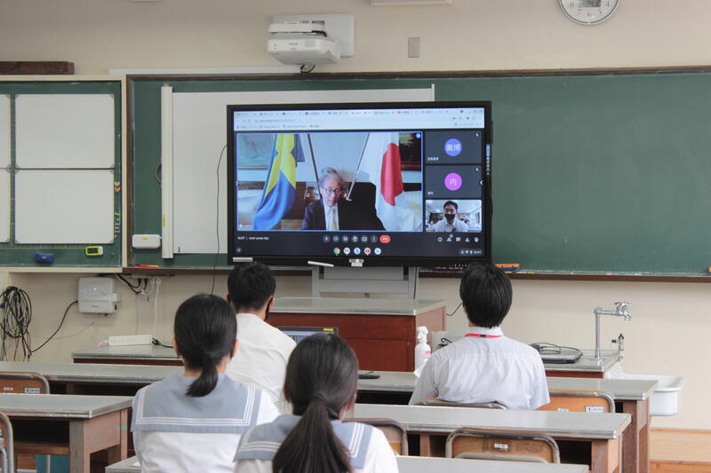 その後、廣木氏と希望する生徒とのリモート座談会が実施されました。生徒から、スウェーデンの福祉について、法について、コミュニケーションについて等の様々な質問が投げかけられると、廣木氏は、終始穏やかな笑顔で丁寧に質問に応じ、時には自ら生徒に質問を投げかけられるなど、とても楽しい雰囲気の座談会となりました。廣木氏の言葉の節々にスウェーデンに対する深い愛情を感じ、コミュニケーションのもととなるべき一番大切なものを感じることができました。