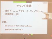 4人1チーム、5グループに別れて、「We should abolish school uniforms(制服を廃止すべきである)」という論題で即興型ディベートに取り組みました。オンラインでPDAの講師の方々から説明を受けた後、それぞれのチームで英語で意見交換を行いました。