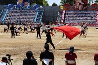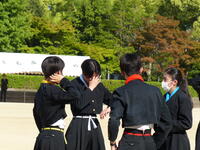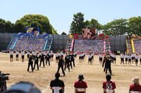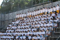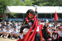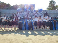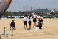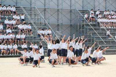雨天のため1日順延となりましたが、体育祭当日となりました。残念ながらグラウンドの状況が悪く、短縮により各学年の集団演技、技巧競技、中高それぞれの応援合戦のみの開催で非常に悔しい結果となりました。できない競技に参加予定だった生徒たちからは残念そうな声が絶えませんでしたが、限られた時間の中で全力で楽しむことができていたようです。応援合戦ではどの団も約1ヶ月間の集大成を堂々と発表してくれました。ぎゅうぎゅうに並んだ櫓からはこれまでにないほど大きな声が聞こえ、観客の方からは何度も拍手が起こり、熱く盛り上がっていました。