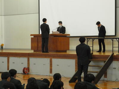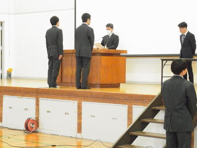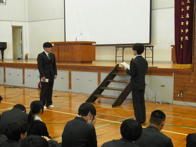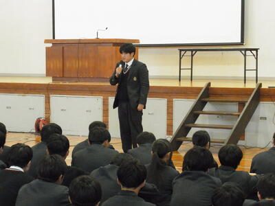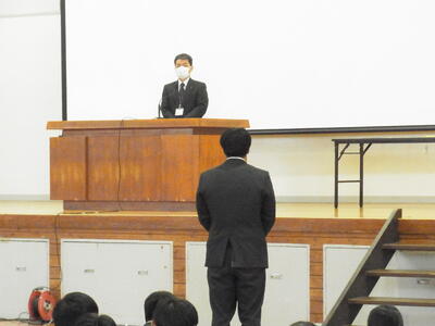 3月24日に風間杯第69回全国高等学校選抜レスリング大会【2025年3月27日(木)~3月29日(土)(新潟市東総合スポーツセンター)】に出場する機械科1年の崎山君の激励会を実施しました。本人からの決意表明のあとに校長先生からの激励の言葉、同窓会より奨励金の授与、生徒会長からの激励の言葉がありました。