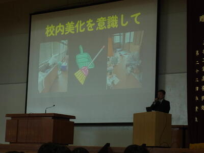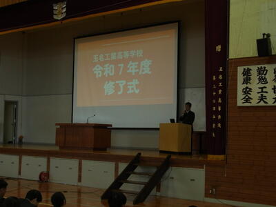 3月24日に体育館にて令和7年度修了式を実施しました。校長講話では西村和久校長先生からスライドを使って「今年度の様々な活躍、進路の成果。玉名市等との連携協定。次年度の学びの継続。交通違反・事故の心配。美化意識を高めて欲しい。」などのお話がありました。