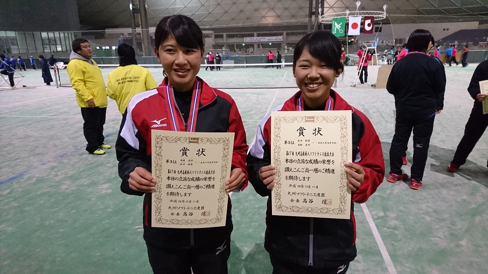 12月11日にパークドーム熊本にて第47回九州高校新人ソフトテニス競技大会に女子の高椋美怜・池田祐萌ペアが熊本県代表として出場し、第3位に入賞しました。本校の女子では九州新人は初出場でしたが、堂々と戦い入賞する事ができました。