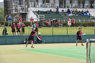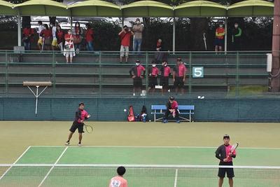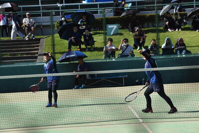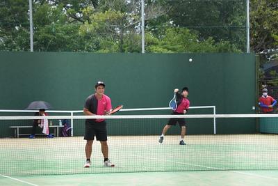 雨の影響で試合開始が2時間遅れて、さらに雨の中での試合となりました。本校ペアはそれほど悪くなかった内容でしたが、雨の中でも相手の鹿児島県チャンピオンペアは上手にゲームを組み立ててきて、デュースにはなるものの、ゲームを取ることはできませんでした。
