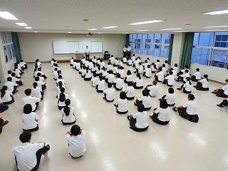 密を避けるため、1年生は実習棟2階工業基礎実習室、2年生は視聴覚室、3年生は図書室と分散し行いました。