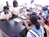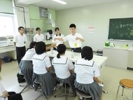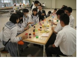 工業化学科の高校生が先生役となり小学生の子ども達に、色が変る反応やアロマビーズの製作、巨大シャボン玉の体験などを行ないました。約4時間程度行ないましたが、こども達はみんなとても楽しんでくれ、準備していた教材や試薬は全て使い切りました。今回初めて築山小学校のPTAからの提案より実施する事ができました。高校生としても大変貴重な経験となりました。