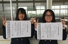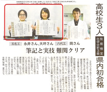 平成28年度前期の技能検定試験において工業化学科3年の大坪遥香さんと永井裕美さんが技能検定3級(化学分析作業)において県内で始めて合格しました。