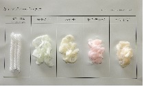 お菓子の着色料を取り出し、その着色料を使って毛糸を染めて比較しました。