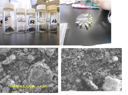 栗・桜・柿などの木の落ち葉の灰を色々な方法で分析しました。大学の実験施設も使わせて頂きました。