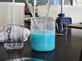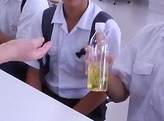 ペットボトルに水酸化ナトリウム溶液を入れグルコース(ブドウ糖)、色素(インジコカーミン)を加える。