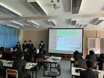 課題研究とは、3年生の授業で、生徒が7班(各班4~6人)に別れ、それぞれがテーマと目標を設定し1年間取り組む授業です。そのまとめとして、2年生を対象に発表会を実施します。