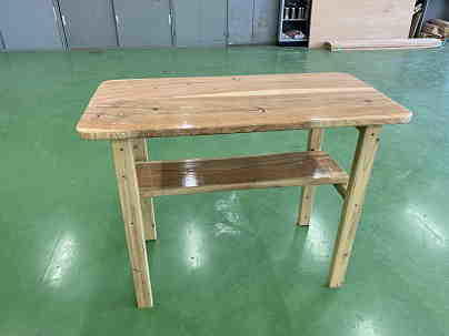 これはテーブルです。厚さ3.5cmある杉板を天板に使用しています。杉の木目や節を生かし、ニス仕上げにしています。