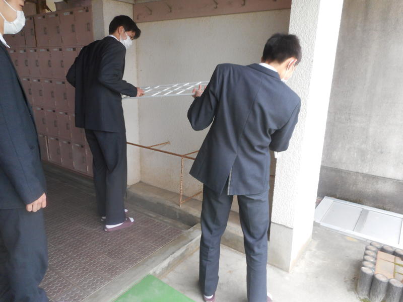 (2)職員昇降口の傘立て・・・職員用の常設の傘立てが使用しにくいことから、