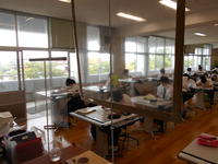 窓も開けての製図室は2mの間隔を確保し、換気も注意を払いました。