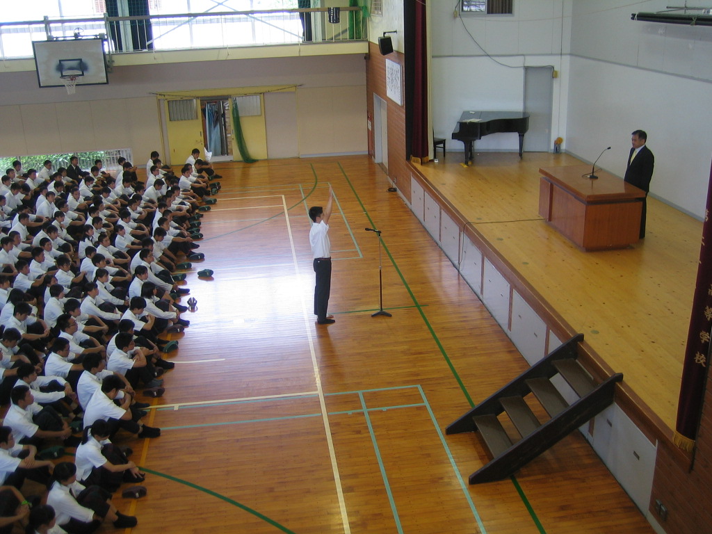 始業式では校長先生より「正しい考え、正しい行動、安心・安全な学校」と「自己限定を破る」ことの講話がありました。さらに、今回から校歌斉唱の伴奏を吹奏楽部の生演奏で歌うことになりました。吹奏楽部は人数は少ないですが夏休みにしっかり練習してきたみたいです。