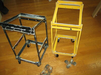 ソフトテニス部が毎日の練習で使用してるボールカート(平成27年に制作・ソフトテニス部の最初の記事に記載)のキャスターが全く機能しなくなったので、キャスターを交換しました。一回り大きいキャスターを取り付けたので動かしやすくなりました。塗装は一部剥げていますが、アルミで作ったのでまだまだ使えます。