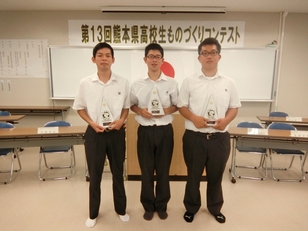 平成28年6月19日(日)に本校で開催された、第13回熊本県高校生ものづくりコンテスト測量部門において、土木科3年の島畑君(岱明中)、西田君(腹栄中)、坂田君(山鹿中)が見事金賞を受賞しました。7月10日(日)には九州大会(鹿児島工業高校)に出場しました。九州大会は、悪天候のため測量をすることができず、計算のみの競技となったため、実力を発揮することはできませんでした。とても残念です。