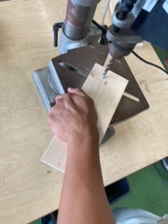 (木工実習:ボール盤使用中)