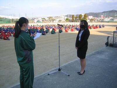 12月10日の長距離走大会の前に新任式を行いました。新しく着任されたのはALTのニーナ・ニュエン(Nina Nguyen)先生です。カナダのカルガリー出身のベトナム系カナダ人女性。カルガリー大学を卒業。大学での第一専門は言語学、次に心理学。将来の目標は、作業療法に携わる仕事とのこと。趣味は、グラフィックデザイン、デジタルアート、旅行、ハイキング、ボルダリング、料理など。日本文化にも強い興味を持っているそうです。