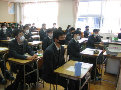 始業式の校長講話では「目標を持って努力することの大切さ」や「基本を身につけることの重要さ」などの話がありました。生徒たちは教室で集中して視聴していました。