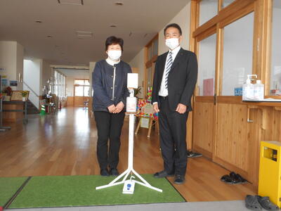 本校を卒業した3年生製作「アルコール噴霧器」を寄贈しました。
