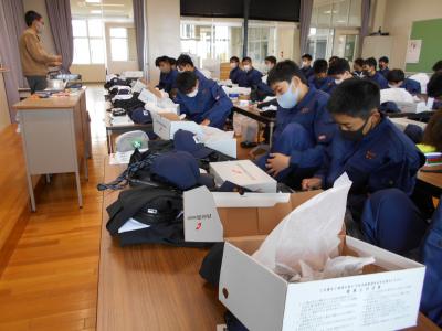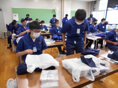 にっこり機械科1年生工業基礎実習オリエンテーションが行われ、新しい実習服・安全靴を試着しました