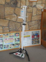 新型コロナウイルス対策のため、校内には手指消毒用の手押しのアルコール消毒ボトルが各所に設置されています。