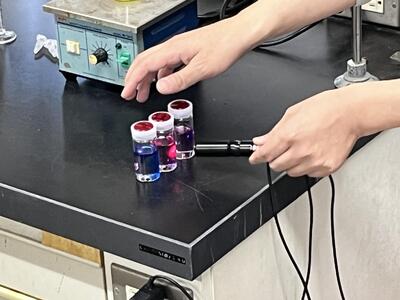 今回は、新留研究室(医療材料)、深港研究室(有機材料・光応答性化学物質)、伊田研究室(無機材料・ナノ材料)についてご説明いただき、その後、それぞれの分野に関する実験を体験させていただきました。