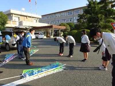写真(下)は、生徒会と玉名警察署による学校前での防犯啓発運動