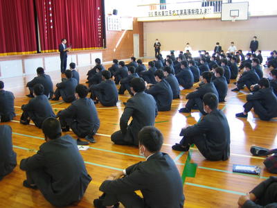 校長先生、進路担当者、学年主任から激励の言葉があり、就職希望者を代表して機械科の城川晃輔君、進学希望者を代表して電子科の岡村優斗君がそれぞれ決意表明をしてくれました。
