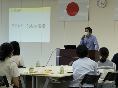 二日目は、玉名市長に立候補するつもりで、玉名市の課題、改善点、玉名市のあるべき姿を考え、玉名市長としての公約として発表しました。実際に現玉名市長の藏原隆浩様に各班の発表を見ていただき、講評をしていただきました。