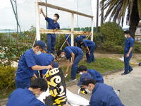 興奮・ヤッター!先日の台風14号(チャンスー)の影響で正門前の看板が吹き飛ばされました