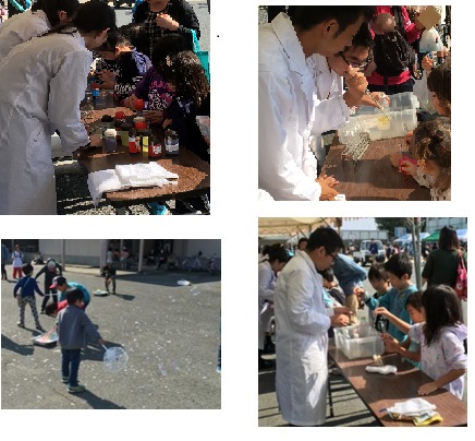 工業化学科の高校生が先生役となり小学生の子ども達に、色が変る反応やアロマビーズの製作、巨大シャボン玉の体験などを行ないました。約4時間程度行ないましたが、こども達はみんなとても楽しんでくれ、準備していた教材や試薬は全て使い切りました。今回初めて築山小学校のPTAからの提案より実施する事ができました。高校生としても大変貴重な経験となりました。