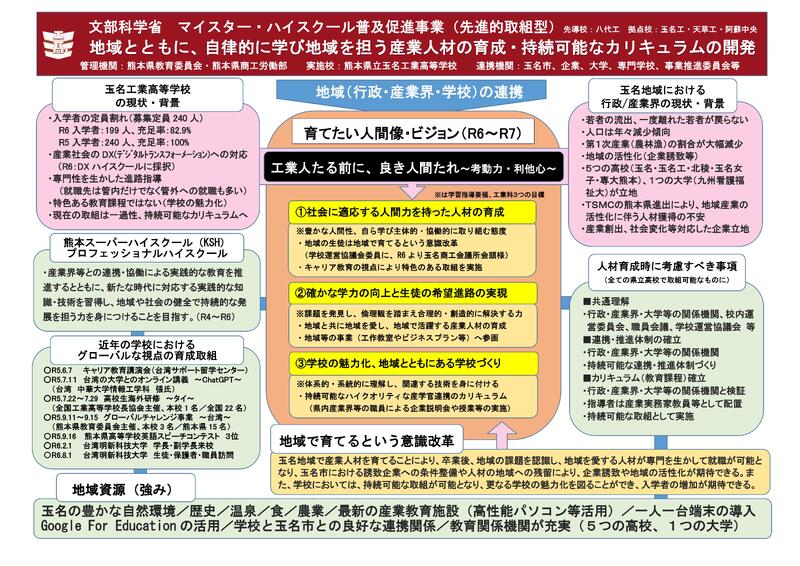 令和6年度より、文部科学省のマイスター・ハイスクール普及促進事業のマイスター・ハイスクール横展開の拠点校として採択されました。このマイスター・ハイスクールの指定については、日本全国で12件採択されており、内訳は先進的取組型4件(本県はこちら)と連携体制強化型8件となっております。令和3年度から令和5年度に八代工業高等学校で実施された事業成果を踏まえ、その取組を県内全体へ広げるための拠点校として、これからの産業界で活躍できる人材の育成を関係機関と連携しながら推進し、持続可能な人材育成のカリキュラム改善を図り、地域や産業界等との対話を大事にし、地域一丸となって人材育成を行う視点を持った熊本県版のモデルプランを確立します。