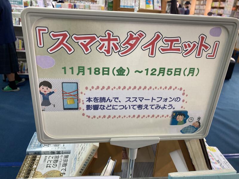 図書委員会では、スマホダイエット開始当初から取り組みを行っていて、年々、その規模や内容は充実しているようです。もちろんスマホの適正利用を促すことも目標のひとつですが、その根底には本に触れてほしいという思いが感じ取れました。スマートフォンの扱い方を見直しつつ、ぜひ図書館に足を運んで、本の世界に触れてみてください。」