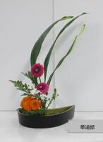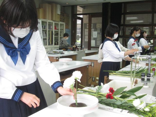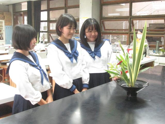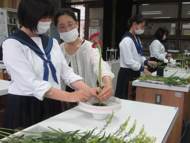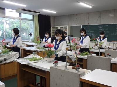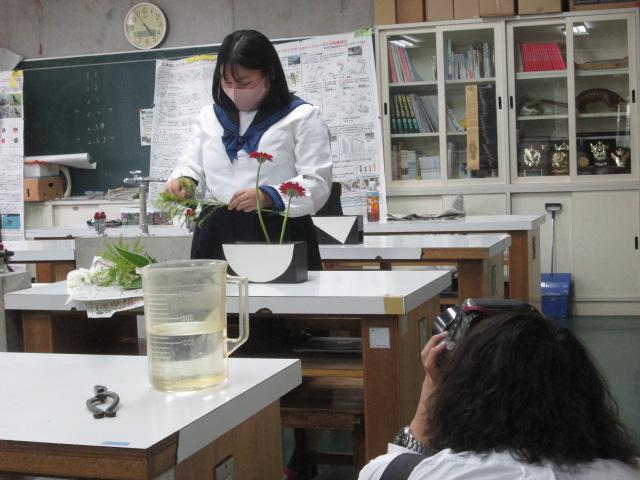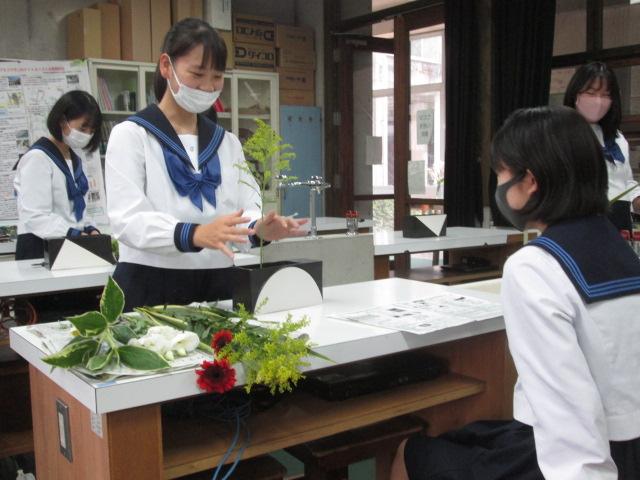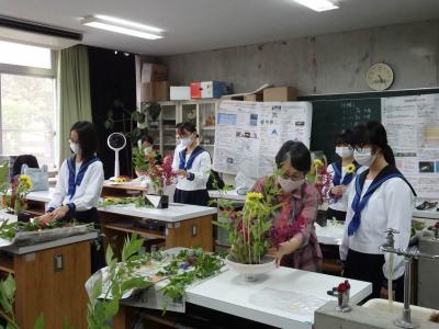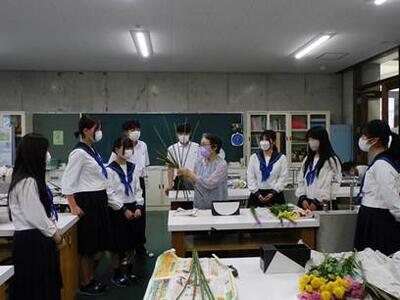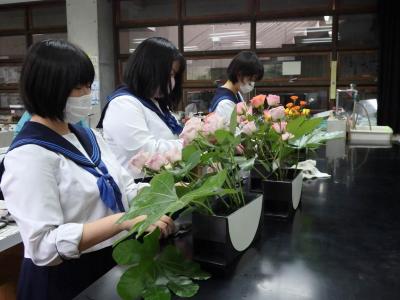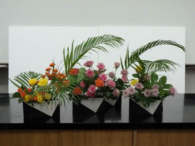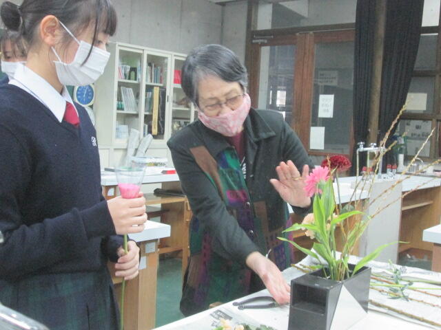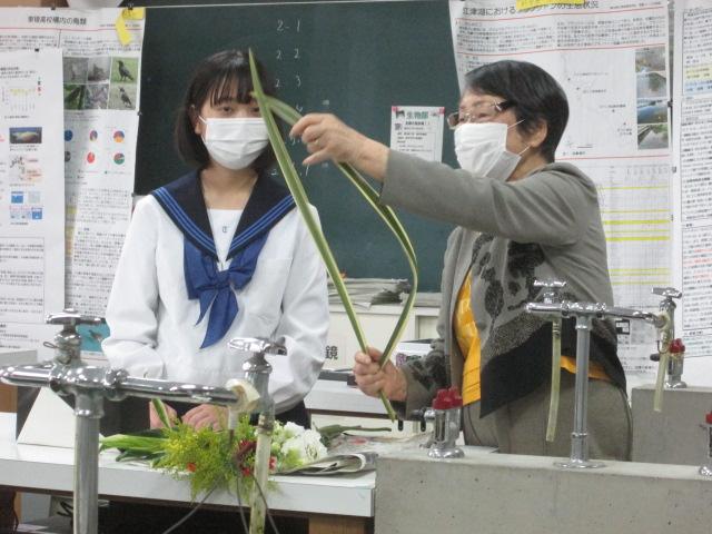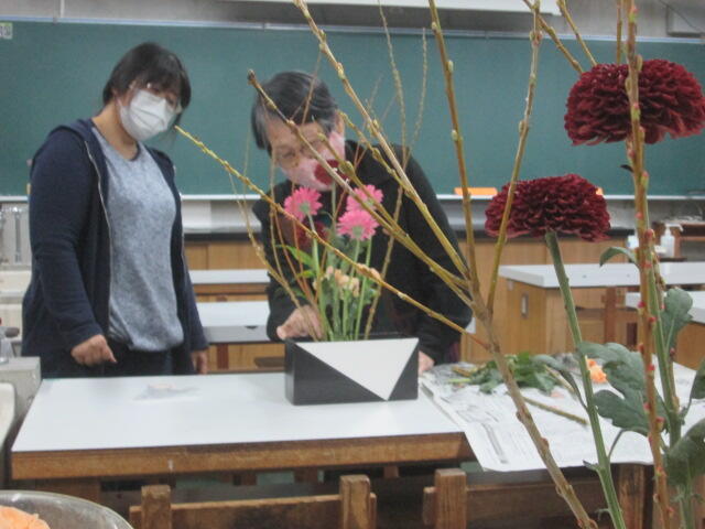 外部講師の先生から花材の特徴や生け方の例を説明していただき、それぞれ生けました。