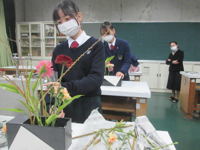 11月10日(水)華道部の活動です。松井先生、生田先生の御指導のもと、生徒2名で頑張っています。華道では、「生命への共感・生命を感じる心」「季節を感じる心」「目に見えないものを感じる心」の育成を目指しています。