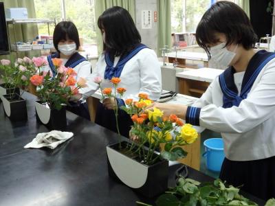 今日で3年生の活動は最後です。3年生2人はバラの花で合作をいけました。