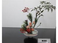 12月は正月花をいけました。花材は松、ナンテン、カーネーション、小菊です。