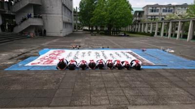 4月3日(土)青空が広がる中で、パフォーマンスの練習を行いました。昨年はコロナ禍に伴い、新入生に向けた披露がかないませんでしたが、今年はようやく披露できるという感慨や歓迎の思いを部員一同紙面にぶつけたいと思います。