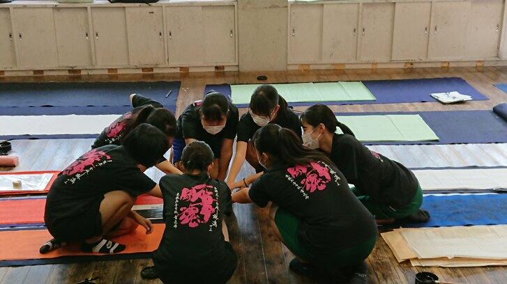 当初は宇土市民体育館で9月18日に実施予定でしたが、新型コロナウイルス感染症感染拡大防止のため、昨年に続き各校での実施となりました。この日のために分散登校の中でもプレ大会を続けながら1人1人が技術を錬磨してきました。中には前日緊張して眠れなかったという人もいましたが、部員7人、心を一つにしてこの日を迎えることができました。