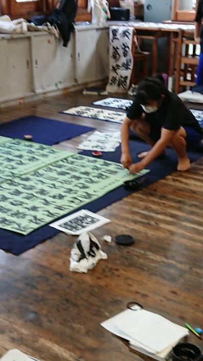 テーマ発表から準備期間は約3日でした。行書、草書を用いて晴れやかに空間美を創出するコンセプトで、2グループに別れての席上揮毫、チャンスは2回(二枚)です。普段小字数を書くことはほとんどないため、苦心が伺えました。審査は指導員の吉田先生にお願いしています。結果が楽しみです。