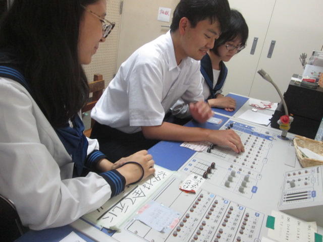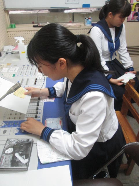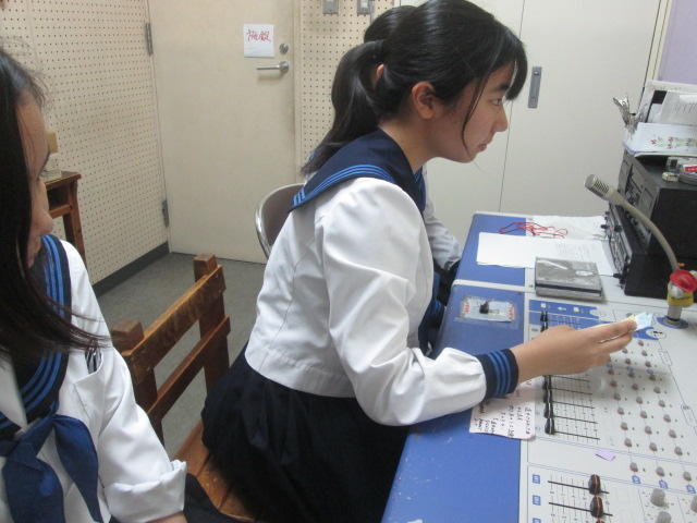 アナウンス部門では校内ニュースの原稿を読むのが決まりです。校長先生がカメラを持って校内の色々なシーンで生徒達の日常の姿を撮影している様子を角田さん、校舎の窓にぶつかる落鳥を実習教師の松藤先生が保護している様子を加賀山さんが原稿にまとめて発表しました。用意した原稿の他に、初日の受付で初めてもらう課題原稿もあり、自分の原稿に続いて読むことが課されました。