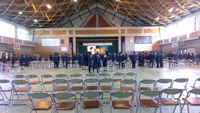 まん延防止等重点措置期間中のため、1・2年生の分散登校は継続中です。本日は1・2年生クラスの半分の生徒が登校し、体育館の設営を行いました。3年生は全員登校し、午前中は式典リハーサルや表彰式・卒業式予行を行い、午後から同窓会入会式を行う予定です。
