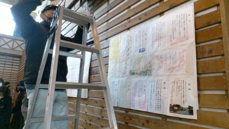 体育館後方に掲示されています。明日の卒業式後は、生徒昇降口に移動して引き続き掲示される予定です。