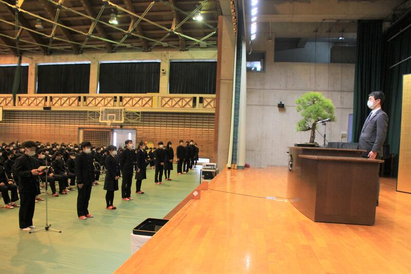 学校長講話・・・卒業式の様子を伝えられ、在校生代表生徒会長森元くんの送辞、卒業生代表秦さんの答辞について紹介され、先日の合格者が語る会など多岐にわたりお話をしていただきました。苦手な単元の克服に取り組むなど、新年度に向けて、充実した春休みを過ごすことを祈念します。